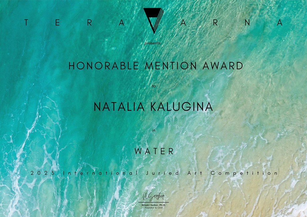 Aug 2023 Juried artist, “4th Water” Art Show, Teravarna online Art Gallery, my painting “Dreaming about the Spring” won Honorable Mention Award